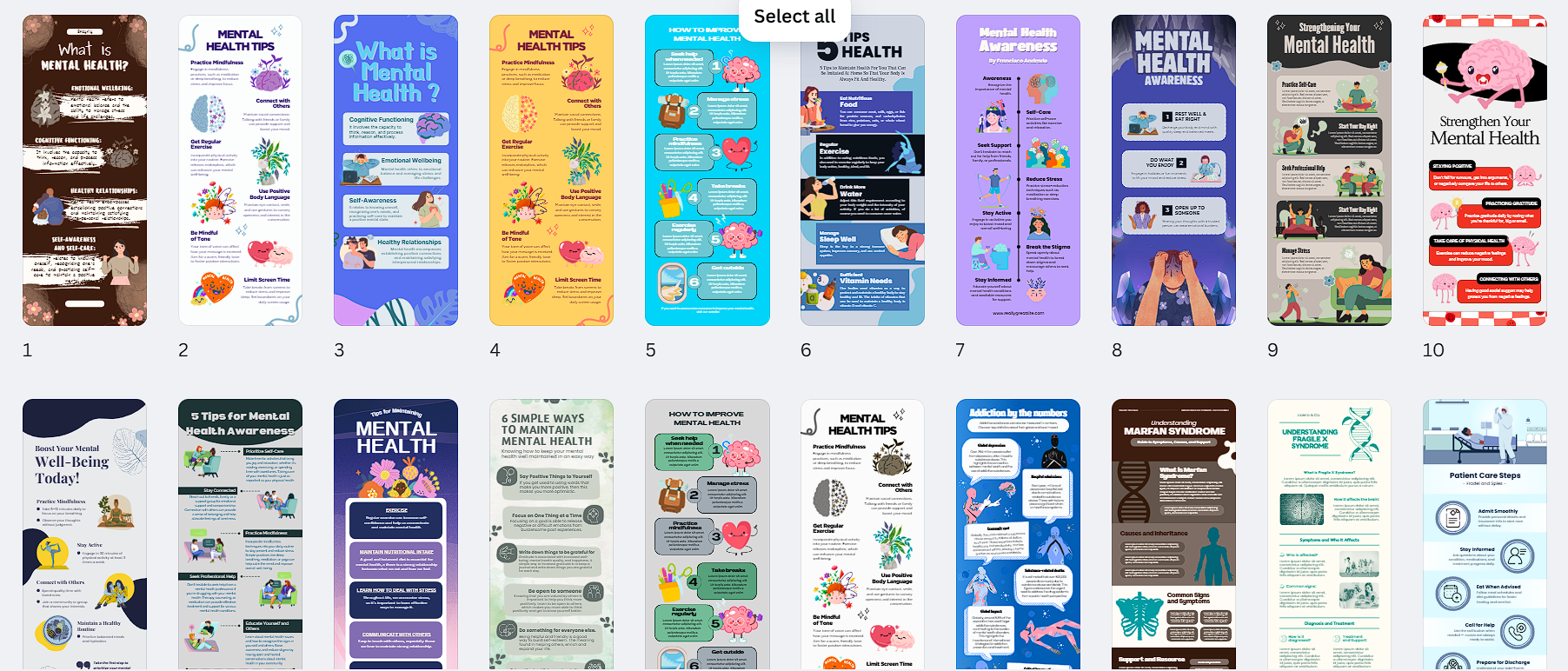 - 100 professionally illustrated infographic templates covering anxiety, depression, self-care, mindfulness, burnout, sleep hygiene, stress management, stigma reduction, and crisis resources.